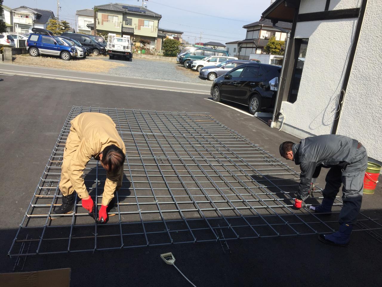 本日事務所駐車場にて、研修生の鉄筋組み立ての練習を致しました。 上達が早く月曜日から現場で作業始まります 頑張って下さい